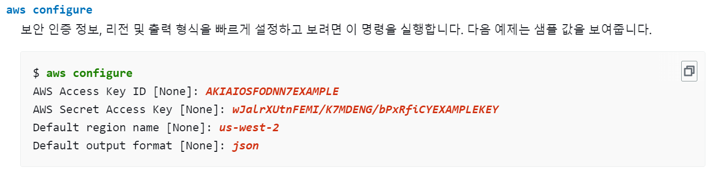 - AWS Access Key ID, AWS Secret Acess Key, Default region name, Default output format 입력